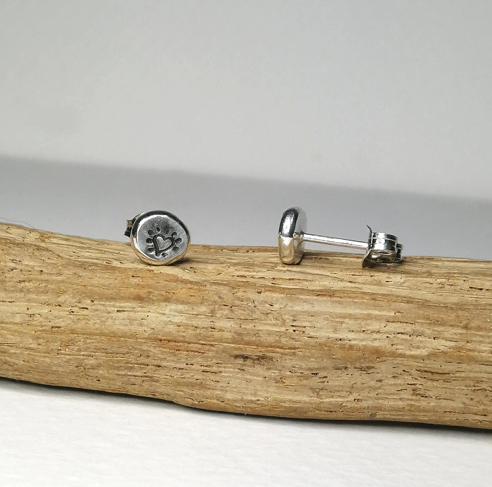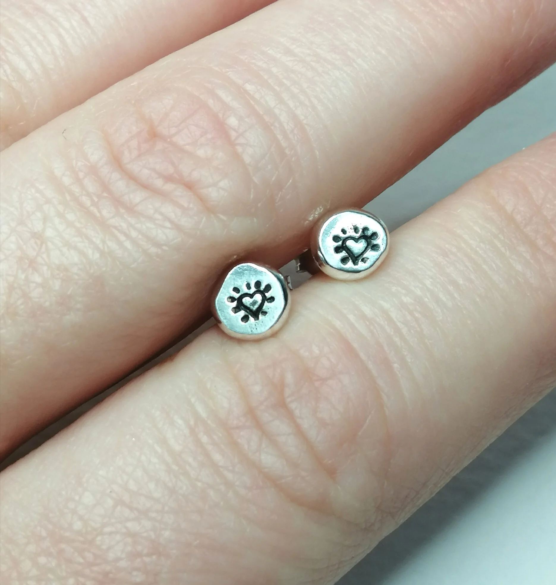 Cute little everyday wear studs. These are made with recycled sterling silver which is hand stamped with a heart design.